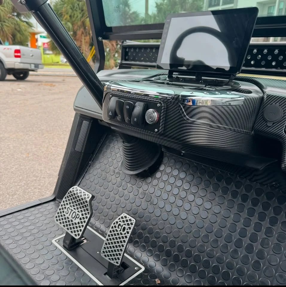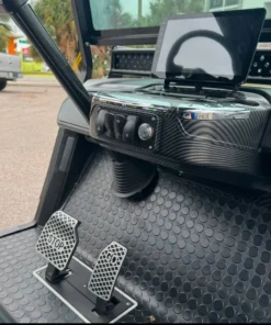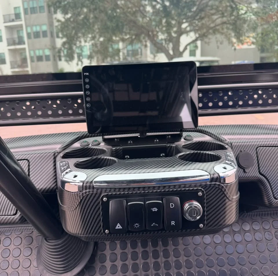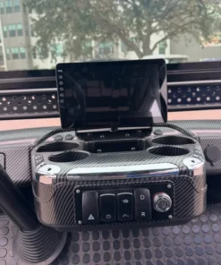 - User-Friendly Dashboard: Features a luxurious carbon fiber style dash with locking glove compartments, a 10.1” digital display multimedia touchscreen with IP67 rating, EcoXGear 28” Bluetooth sound bar, Bluetooth connectivity, phone integration, radio, music, back-up camera, forward/neutral/reverse switch, USB and 12V plugs, multiple cup holders, USB ports, pre-wired 12V switches, digital gauges, and a key switch for convenience.