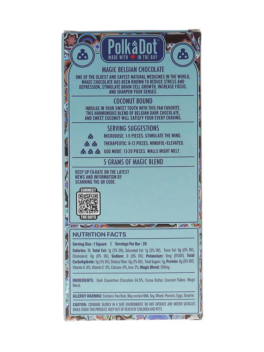 For those who enjoy tropical flavors combined with high-quality dark chocolate, Coconut Bound PolkaDot Magic Mushroom Belgian Dark Chocolate is a must-try. Order now from our online headshop, Olofly, and treat yourself to a truly unique chocolate experience!