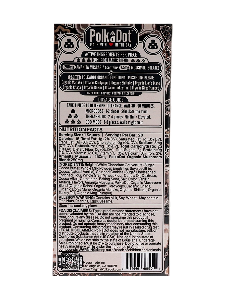 Irresistible Swirl of Flavors: Cookies & Cream Swirl PolkaDot Magic Mushroom Belgian White Chocolate offers an irresistible swirl of flavors, where the richness of white chocolate perfectly complements the crunchy essence of cookies and the velvety creaminess of the swirl.