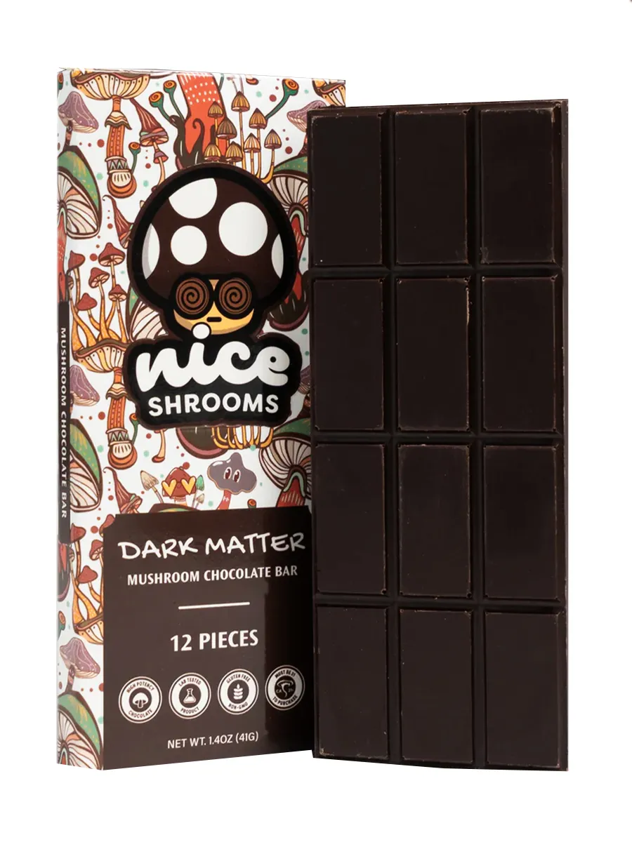 Order now from our online headshop, Olofly, and enjoy the deliciously functional experience of Dark Matter Nice Shrooms Mushroom Chocolate Bar!