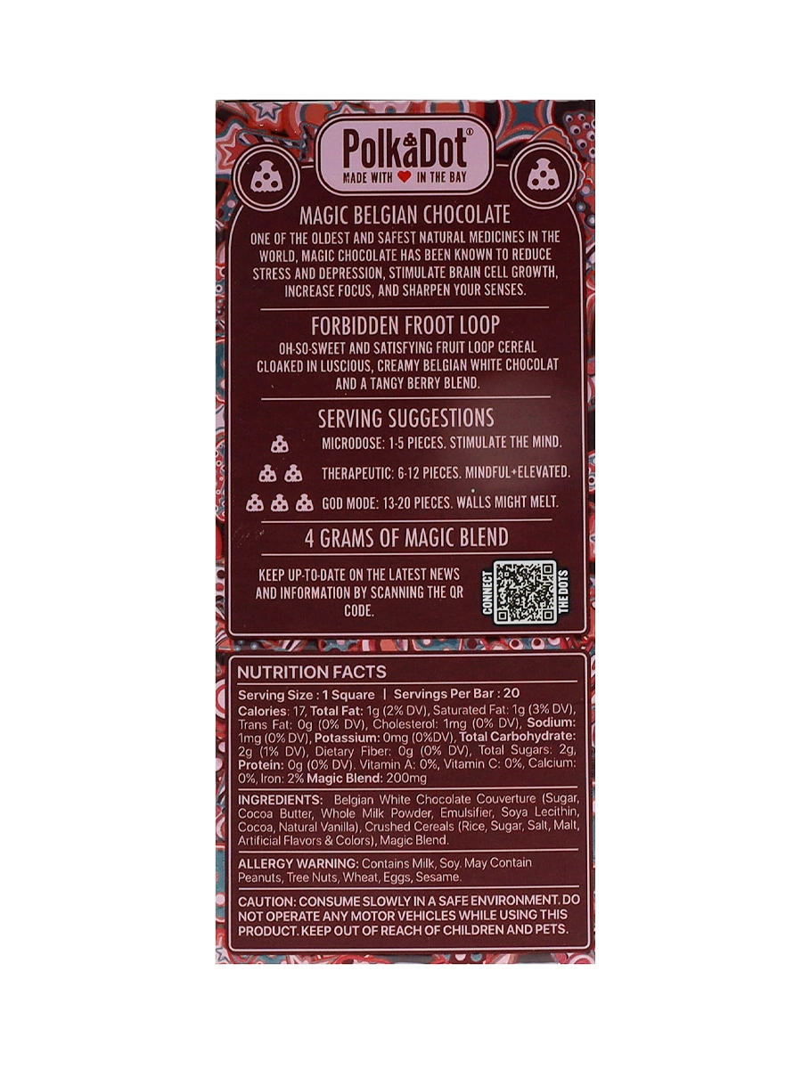 Transport yourself to a realm of nostalgia with our Forbidden Froot Loop PolkaDot Magic Mushroom Belgian White Chocolate. Indulge in the playful flavors of childhood as colorful fruity loops dance in creamy white chocolate, enhanced with a hint of magic mushrooms. Each bite is a whimsical journey, offering 200mg of magic per piece.