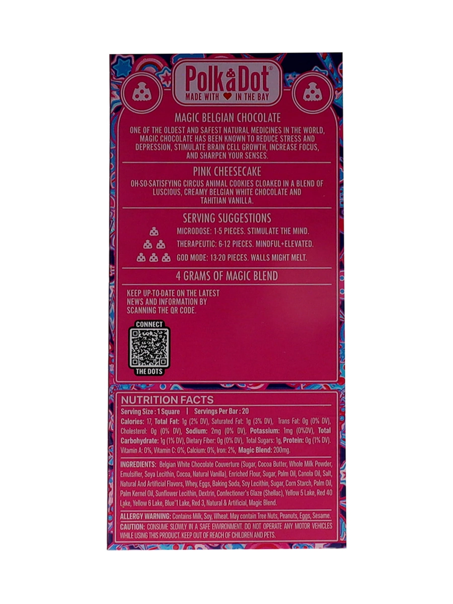 Treat yourself to the enchanting allure of Pink Cheesecake PolkaDot Magic Mushroom Belgian White Chocolate, infused with 200mg of magic per piece. Indulge in a sensory journey with these delectable treats, featuring: