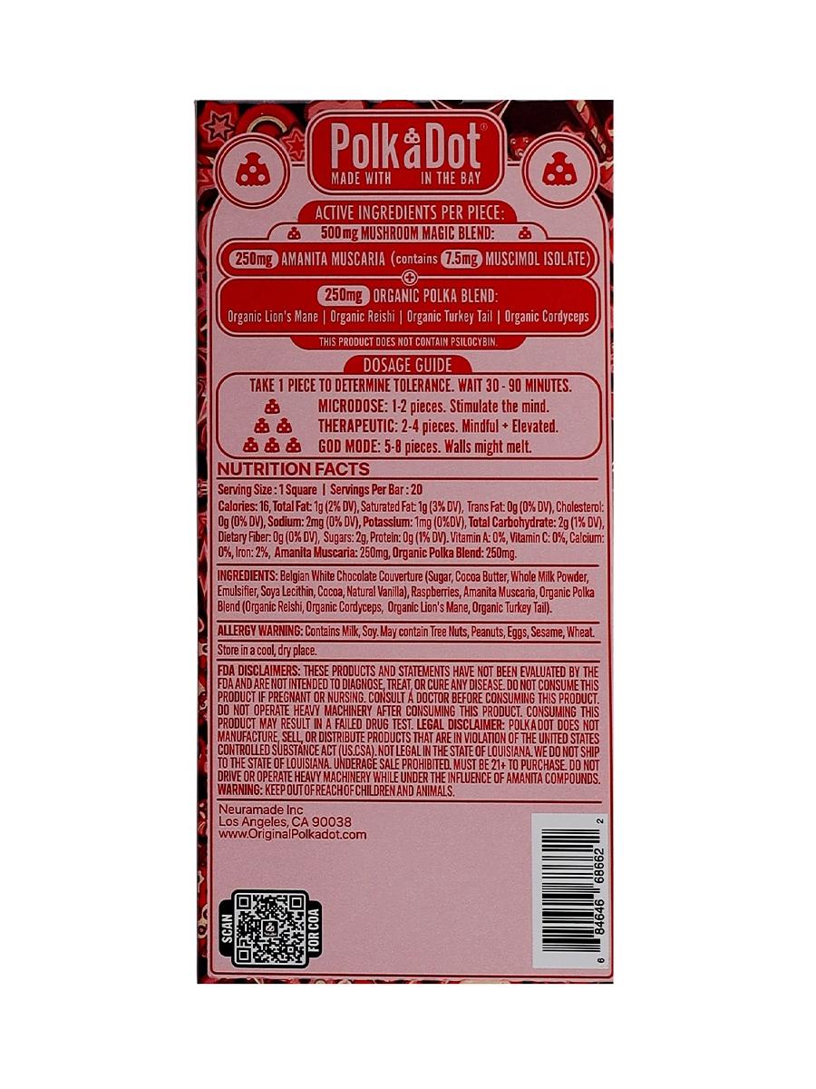 Irresistible Harmony: Raspberry Muffin PolkaDot Magic Mushroom Belgian White Chocolate creates an irresistible symphony of flavors, where creamy white chocolate meets the nostalgic essence of raspberry muffins, resulting in a truly enchanting culinary experience.