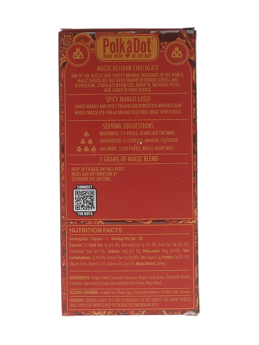 For those who love exotic flavors with a bit of a kick, Spicy Mango Lassi PolkaDot Magic Mushroom Belgian White Chocolate is a must-try. Order now from our online headshop, Olofly, and elevate your chocolate experience with this bold and unique treat!