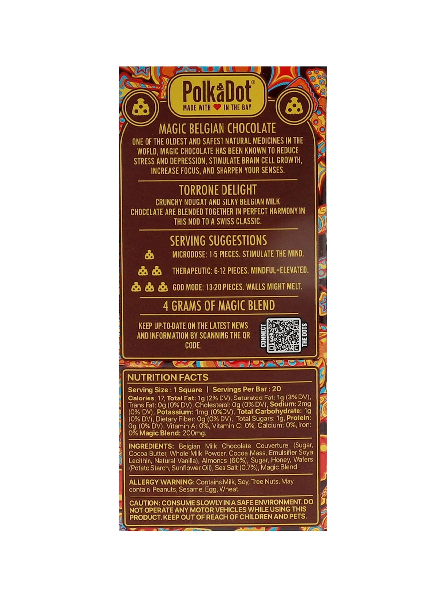 Experience pure bliss with Torrone Delight PolkaDot Magic Mushroom Belgian Milk Chocolate. This exquisite chocolate combines the classic Italian nougat flavor with the enchanting effects of 200mg of magic mushroom per piece. Each bite offers a harmonious blend of creamy chocolate, crunchy nuts, and chewy nougat, delivering a sensory delight like no other. Whether you’re treating yourself or sharing with friends, this chocolate is sure to elevate your experience to new heights of euphoria and relaxation.