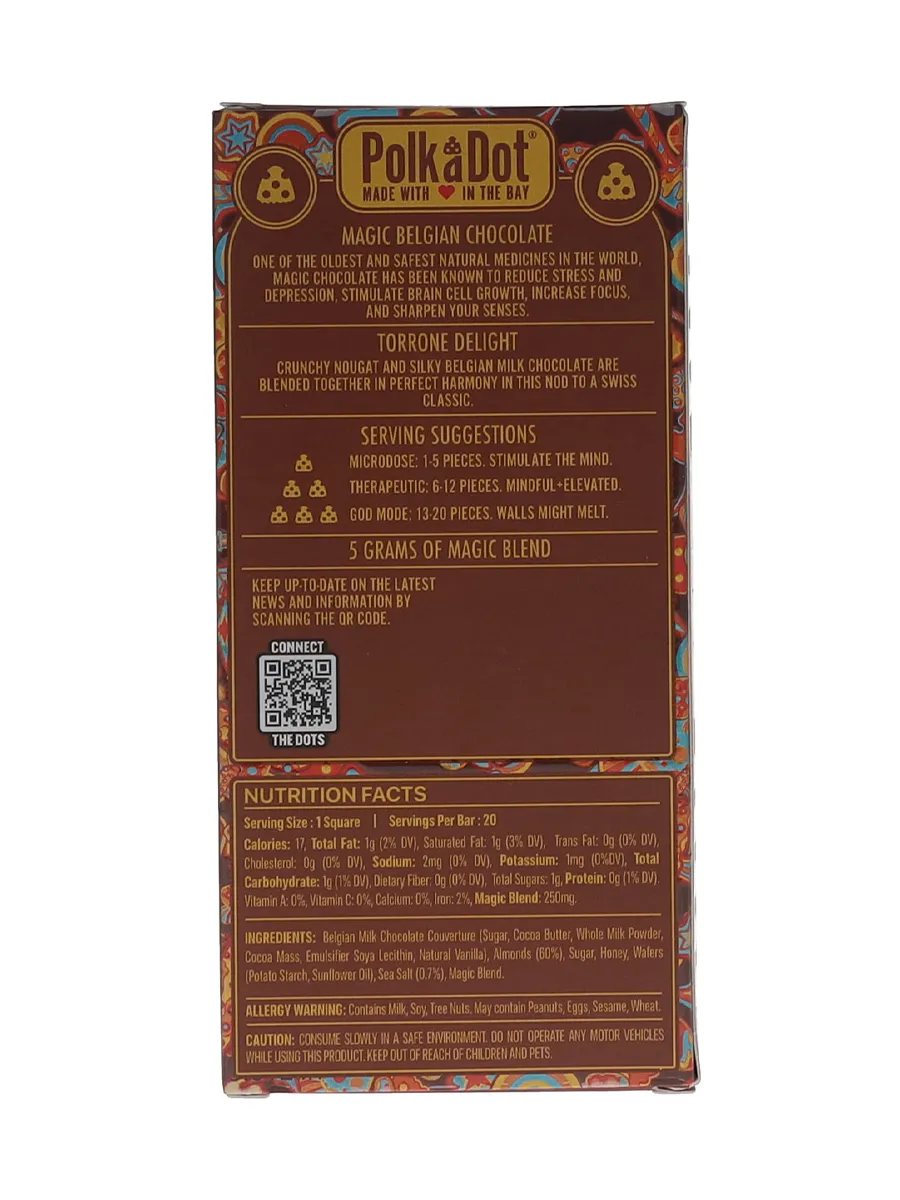 For those who love the classic flavors of torrone paired with rich milk chocolate, Torrone Delight PolkaDot Magic Mushroom Belgian Milk Chocolate is a must-try. Order now from our online headshop, Olofly, and enjoy a truly delightful chocolate experience!