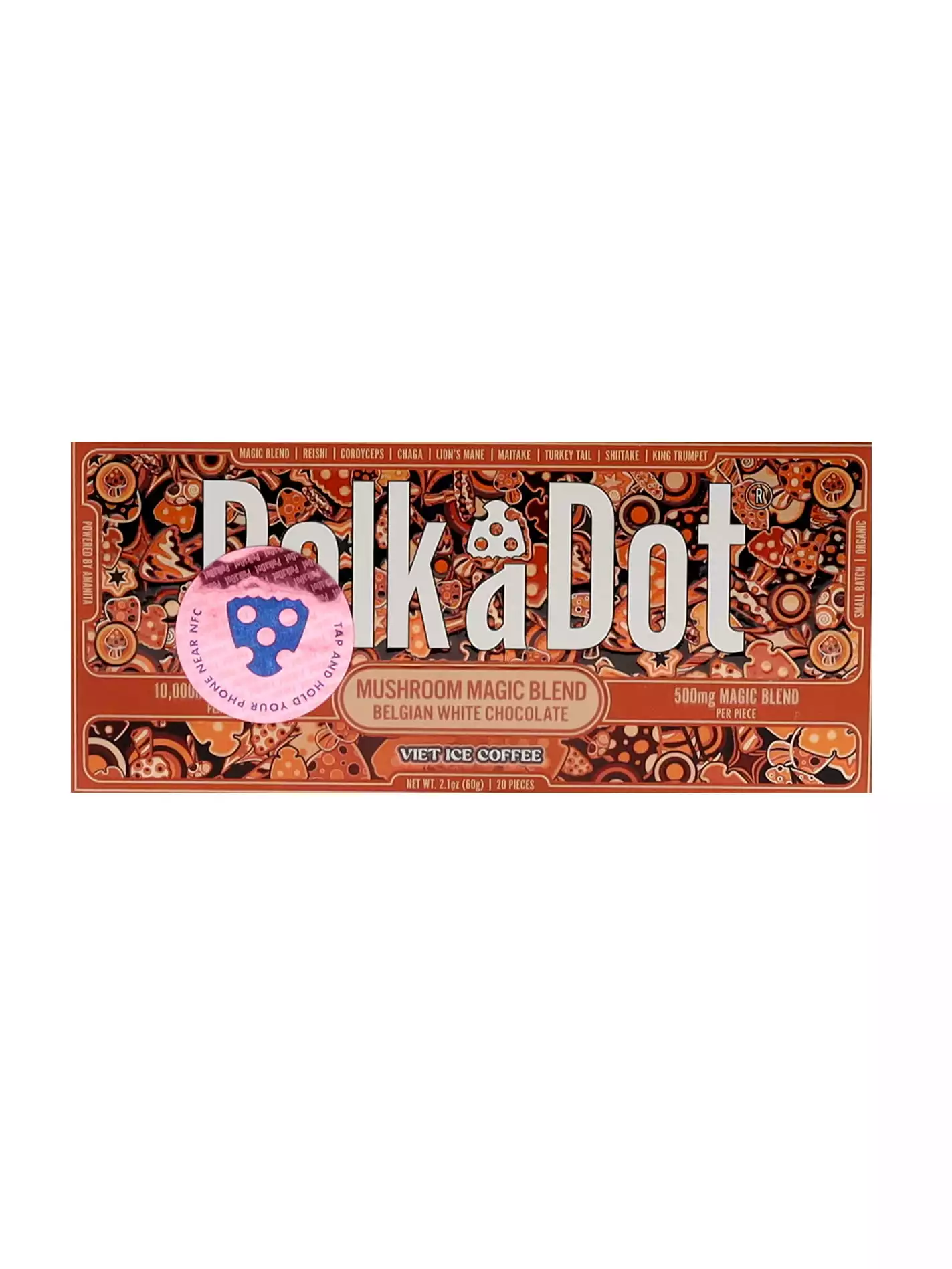 Flavorful Harmony: Viet Ice Coffee PolkaDot Magic Mushroom Belgian White Chocolate brings together the sweetness of white chocolate and the robust flavors of Vietnamese iced coffee. The result is a delightful harmony of tastes that transports you to the bustling streets of Hanoi with every bite.